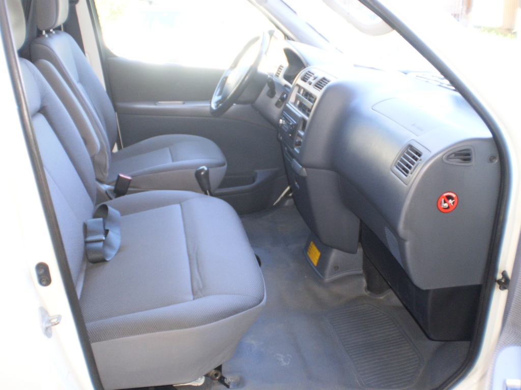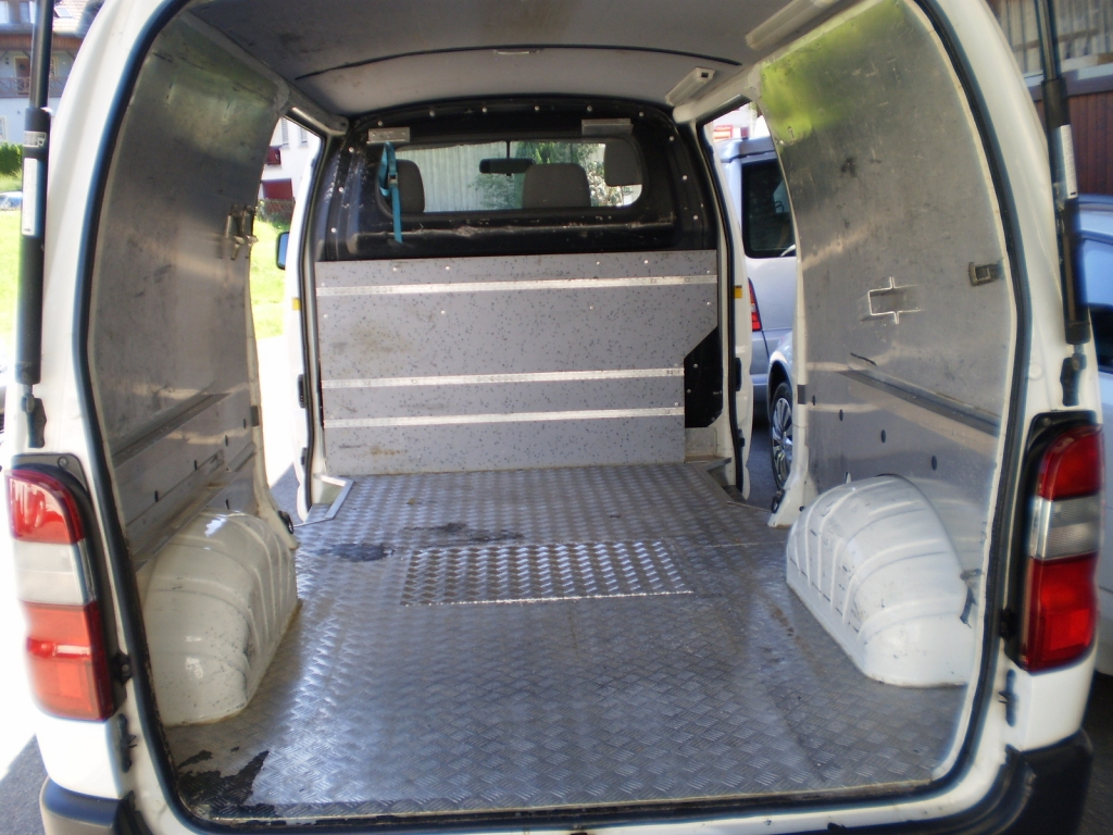 Serienmässige Ausstattung. • 5-Gang-Getriebe . • Ablagefach im Dachbereich . • Airbag Fahrerseite . • Antiblockiersystem (ABS) . • Armlehne für Fahrersitz . • Armlehne vorne mit Ablagefach . • Aussenspiegel rechts und links beheizt und elektrisch verstellbar, asphärisch gewölbtes Spiegelglas . • Befestigungsösen im Laderaum . • Cupholder vorne . • Drehzahlmesser . • Drittes Bremslicht . • Elektrische Fensterheber vorne . • Ersatzrad unter dem Fahrzeug montiert . • Fahrersitz höhenverstellbar . • Getönte Scheiben . • Gurtstraffer vorne . • Handschuhfach . • Heckklappe . • Heckscheiben-Wisch-/Waschanlage mit Intervall . • Hinterachsdifferential mit begrenztem Schlupf (LSD) . • Höhenverstellbare Gurten vorne . • Kühlergrill verchromt . • Kunststoffbodenmatte vorne . • Laderaumtrennwand mit Fenster . • Lenkrad höhenverstellbar . • Leuchtweitenregulierung von innen . • Nebelschlussleuchte . • Oxydations-Katalysator . • Radio/CD-Player . • Radiovorbereitung, Antenne, Entstörung und 2 LS . • Radzierblenden . • Scheibenwischer vorne mit Intervall . • Schiebetüre links und rechts . • Seitenaufprall-Schutzsystem . • Servolenkung . • Sicherheitsgurte auf allen Plätzen . • Stahlräder 15J . • Stoff-Ausstattung . • Tageskilometerzähler . • Tankdeckel-Entriegelung von innen . • Uni-Lackierung . • Vorbereitung für Dachträger . • Wassertemperaturanzeige . • Wegfahrsperre elektronisch . • Zentralverriegelung mit Fernbedienung . Optionale Ausstattung. • Airbag Fahrer und Beifahrer . Extras. •Dachträger. Nachrüstungen und Zubehör. •Anhängerkupplung.
